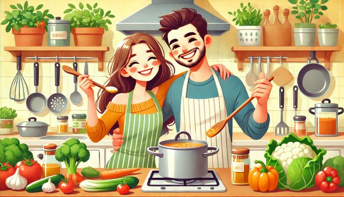 آشپزی کردن میتواند یک فعالیت سرگرمکننده و بسیار رومانتیک باشد. انتخاب یک دستورالعمل خاص یا یک غذای جدید که هر دو از آن لذت ببرید، به شما این فرصت را میدهد که وقت بیشتری را با هم سپری کنید و همزمان یک غذای خوشمزه درست کنید. شما میتوانید برای دسر نیز یک کیک ساده یا شکلات ذوب شده درست کنید.